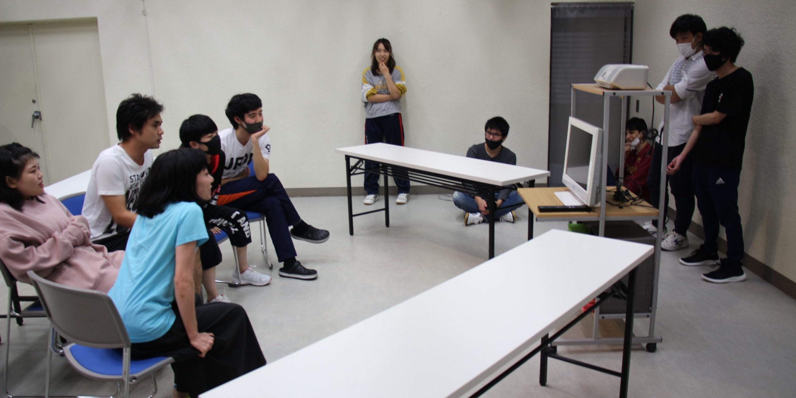 今回は(大学などにある)寮のリビングをイメージした空間を作り、一人がテレビを見ていて、他の人が何の番組を見ているか推測して、なんとなく解ったら部屋に入り、見ているテレビ番組について会話するというエクササイズでした。